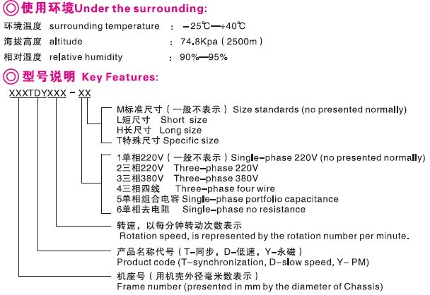This product is a closed structure.Its good characterist-ics are high reliability and long life,small running time vibration,low noise,stable rotor speed,long starting torque.There is no current impact when it's started and its load charge is very small.It has a capacity of self loc-king and it cal quick start,stop and reverse,etc.